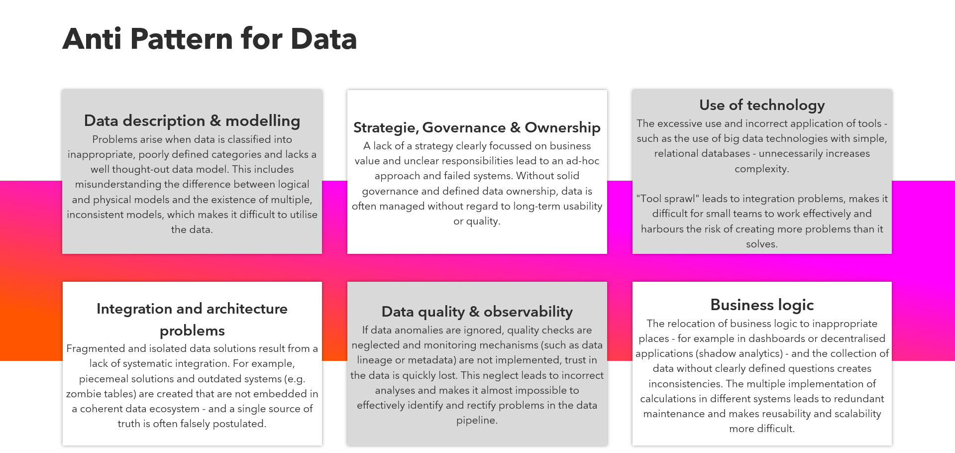Being longer in a data strategy project of an enterprise, I often get a very good big picture about what works well and what works wrong, if it comes to data. There are repeating patterns - or better call them anti-pattern - you identify as the reason for the problems in creating value from data.